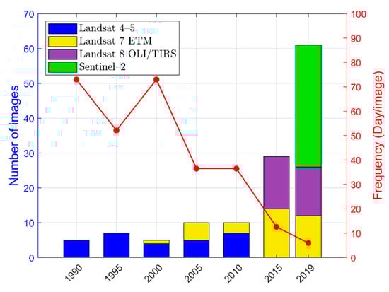 In this research, all available scenes of Sentinel-2 and Landsat satellite series, i.e., Landsat 4–5 Thematic Mapper (TM), Landsat 7 Enhanced Thematic Mapper Plus (ETM+), and Landsat 8 Operational Land Imager/Thermal Infrared Sensor (OLI/TIRS) over the period 1990–2019, were collected and utilized for detecting the coastline dynamic and estimating its change rate in Quang Nam province. It is noted that only satellite images with a percentage of land cloud cover below 20% were used for the analysis. Figure 3 shows the time series of the total number of analyzed images and their frequency. In order to validate the shoreline detection result from DSAS, we conducted a field survey of shoreline positions along the northern part of Cua Dai in 2018. Additionally, a geological map in the year 1996 was also collected from the Vietnam Geological Survey Institution to clarify one of the contributors to the erosional/accretional rate.