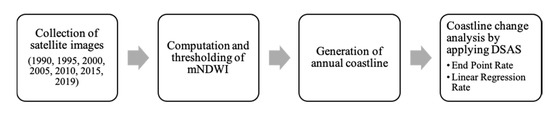 In order to achieve the shoreline change assessment purpose, the Digital Shoreline Analysis System (DSAS), an add-in to the Esri ArcGIS desktop, has been adopted to analyze coastline change because of its capability to monitor, display, and map long-term/short-term shoreline advance/retreat [5]. Moreover, DSAS can estimate the rate-of-change statistics from multiple historical coastline positions to capture the expansion and regression in coastline morphology. DSAS technique for calculating shoreline change rates is based on observed variations in coastline locations over time. The reported rates are measured in meters per year along transects. DSAS combines the separate module calculations once the user-selected rate-change calculations have completed processing, and the outcome is made available as an attribute table in ArcMap. There are various rates of change statistics given by DSAS, including Net Shoreline Movement (NSM), Shoreline Change Envelope (SCE), End Point Rate (EPR), Linear Regression Rate (LRR), Weighted Linear Regression Rate (WLR), etc. [19]. The modified Normalized Difference Water Index (mNDWI) is used for classifying land and water regions on satellite images. Hence, the shoreline position, which is the boundary between land and water areas, will be extracted based on the threshold of the mNDWI [20]. The annual coastlines are detected from the Water Frequency Index (WFI) computation. The overall methodology is summarized in Figure 4.