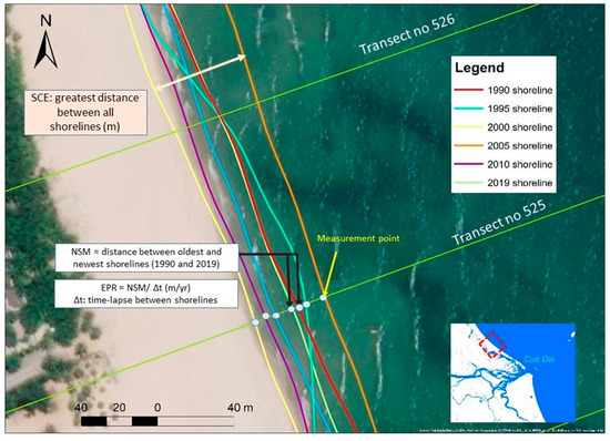 The EPR is calculated by dividing the distance of coastlines movement, precisely between the oldest and youngest coastlines, by the number of years between their captured dates (Figure 5). It means that the EPR aims to transform Net Shore Movement (NSM) to an annual change rate (m/year) [29]. The EPR is expressed using the following Equation (3).