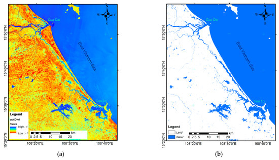 (a) An example of the mNDWI map and (b) land–water classification map of Quang Nam province on 4 July, 2019.