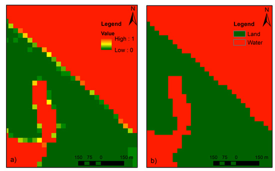 In this study, each mNDWI computation was classified into three classes, i.e., 0 for land, 1 for water, and no-data (which represents clouds and shadow areas). Hence, the representative land–water classification map for each year was produced by applying the WFI, introduced by Xu [25]: