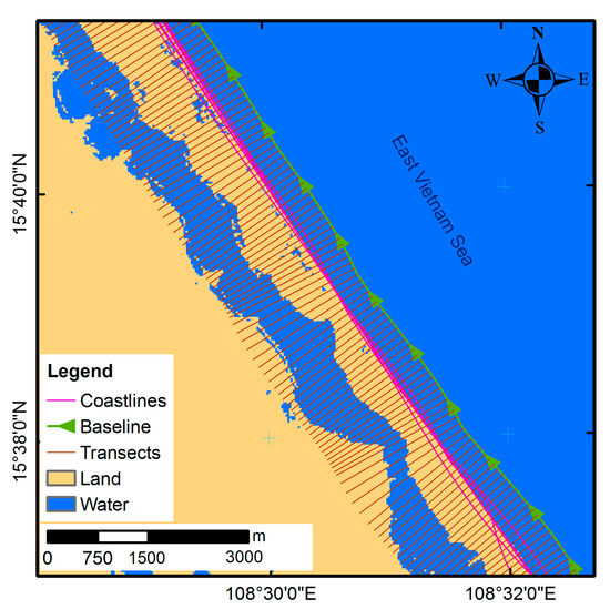 DSAS is the computer software that calculates the shoreline movement for both spatial and temporal scales from extracted coastlines. The transect-based method in DSAS software was used for detecting coastline change by creating perpendicular transects between the self-defined reference baseline and multi-temporal coastlines [25]. Transects are only generated once there is a parallel construction of baseline and historical coastlines [27]. This research manually generated the baseline along the shoreline with various directions as coastline data is not continuous [28]. Transects were created after setting attributes for both coastlines and baseline. The intersection between transects and shorelines will contribute to measurement points that provide location and time information used to calculate rates of change. After running DSAS, the outputs include various estimators interpreting the values of change and attached statistical results during the studied period. In this research, two parameter functions in DSAS, i.e., End Point Rate (EPR) and Linear Regression Rate (LRR), were taken into account to calculate the coastline change rates and analyze the variation of the Quang Nam coast in terms of spatial and temporal scales.