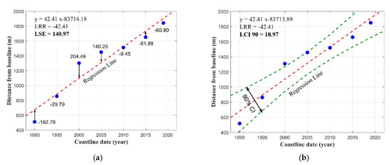 Example of DSAS supplemental statistics for Transect ID 509, with blue dots as the measurement point in each year and their distance from the baseline to the intersection point; red dash presents the best-fit slope (regression line of transect); LRR is computed by the sum of squared residuals. The slope of the equation describing the line is the rate. (a) the LSE values and (b) LCI90 points.