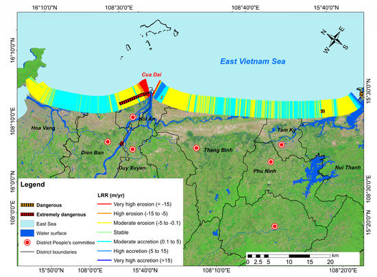 Figure 13 shows the spatial variation results of the Quang Nam coastline by applying DSAS 5.0 software. Seven corresponding categories for different levels of erosion and accretion along the coast were computed, including very high erosion rate (<−15 m/year), high erosion (from −15 to −5 m/year), moderate erosion (from −5 to −0.1 m/year), stable (from −0.1 to 0.1 m/year), moderate accretion (from 0.1 to 5 m/year), high accretion (from 5 to 15 m/year), and very high accretion (>15 m/year). The result indicated both erosion and accretion phenomenon, marking severe morphological change along the studied area. Accretion is dominated mainly in the south part of the Cua Dai estuary at moderate to high accretion rates (from 0.1 to 15 m/year). Dien Ban, Tam Ky, and part of Thang Binh districts were accreted at moderate range only. The considerable land loss was observed in the northern part and a short segment in the south of the Thu Bon river mouth.