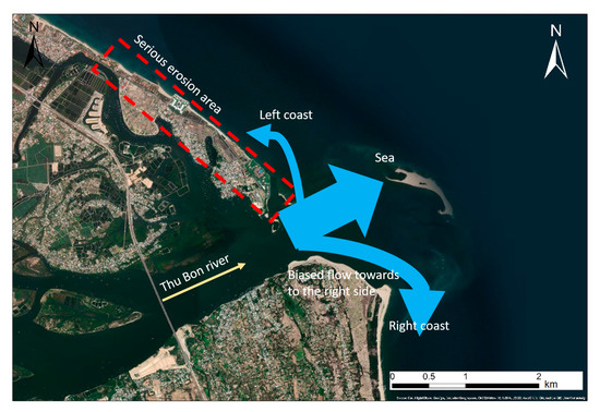 Meanwhile, locations far from the estuaries observed no significant shoreline variability. This result shows good agreement with the survey by Asplund and Malmstrom [38] and research using Google Earth images by Tanaka et al. [36]. More precisely, the survey and research results show that the eroded coastal length in the northern part of Cua Dai is nearly 8000 m (red dashed line in Figure 13), closely matching the DSAS calculation with 80 high and very high erosion transects. This result was also consistent with the landward coastal shift at the north bank of Cua Dai by JICA [39] (Figure 14).