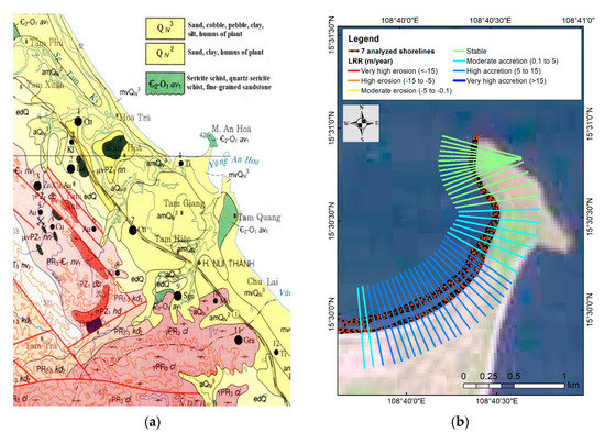 (a) Geological map (source: Vietnam Geological Survey Institution) and (b) spatial variation of the coastline from Cua Lo estuary to An Hoa cape.