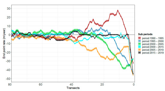 Temporal variation of the Quang Nam shoreline was further analyzed, focusing on the coastline in the northern part of Cua Dai where a remarkable morphological change has happened. In order to show a different pattern of the coastline rate in terms of EPR indicators, more than 80 transects over 6 sub-periods along the northern part of the Cua Dai estuary were drawn to evaluate the movement as temporal analysis, in which Transect 80 is the closest position to Cua Dai estuary. Figure 16 depicts the overall analyzed results from 1990 to 2019. From Transects 0 to 40, the shoreline experienced a slightly moderate to high erosion rate ranging from 0.1 to nearly 10 m/year. However, the shoreline location near the river mouth has an erosion-dominated trend at a very high rate over a long period, as seen from Transects 40 to 80 in Figure 16.