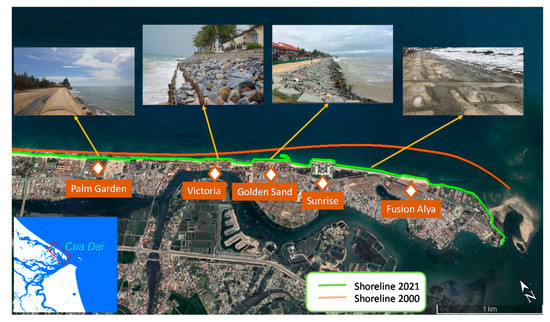 Several mechanisms could be associated with this rapid erosion, including human activities on river basins such as dam and hydropower constructions, which led to the reduction of sediment to the estuary areas [41]. Moreover, the artificial resort’s seawall and groin could also cause severe coastal erosion because it interrupted the dominant longshore sediment transport [39]. For instance, severe erosion happened at the segment where the Golden Sand resort’s groin and Sunrise resort’s seawall were constructed (Figure 17).