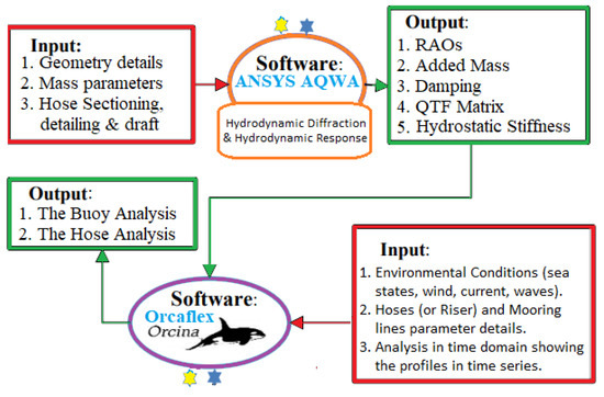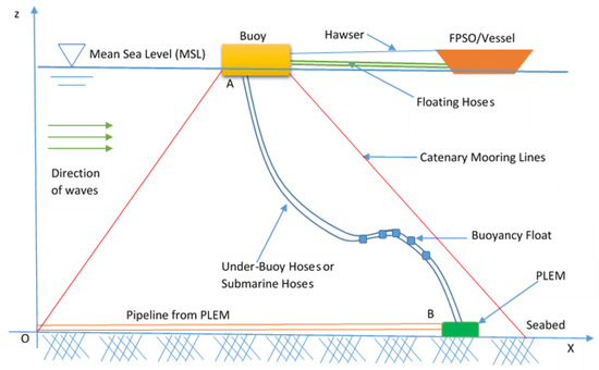 Oil exploration has been delivered using more flexible platforms and lighter conduits like composite risers and marine hoses in recent times. With the development of these flexible platforms, there is an increase in energy exploitation developed using offshore systems, such as catenary anchor leg moorings (CALM) buoys, position buoys, wave energy converters (WECs) and ocean observation buoys. However, while some systems are for energy storage and conversion, others are for loading purposes. With variations on environmental conditions for oil explorations, particularly for harsh, hurricane, benign, or squall conditions, there are advances in their application as adopted recently in loading and offloading marine hoses [1,2,3,4]. These hoses mainly transfer fluid during production, storage, export, and fluid-service delivery (or simply loading and offloading) purposes [5,6,7]. These hoses are classified into: floating, submarine, dredging, reeling, and sea-water intake riser (SWIR) hoses. They present the following advantages: they are cost-effective, easier to install, have high flexibility, are mostly self-floating, and are light-weight [8,9,10]. However, they have a short service life of fewer than 25 years, depending on the application requirement. CALM buoy hose systems can take configurations that differ based on the application and terrain of the environment. The configurations can be Lazy-S, Lazy-wave, Steep-S, or Chinese-Lantern. However, due to different seabed profiles, there are different factors to consider in choosing either linear or nonlinear seabed models. Generally, bonded hoses have extensive applicability in the industry as industrial hoses and marine hoses [11]. However, due to the need for sustainable materials, increased research has been reported on hoses with materials like composites [12,13,14]. Some advances have been made in using composites as reinforcements on marine hoses [15,16,17,18,19]. Other advances related to the tubular hoses are composite marine risers, which have also notably progressed [20,21,22,23,24,25,26]. These structures have been designed by considering different techniques, design tools, and material considerations. As such, there are a variety of methodologies for assessing the structural behaviour and dynamical behaviour of CALM buoy-hose coupled systems [27,28,29,30]. The dynamical behaviour of offshore systems attached to a floating offshore platform (FOS) can be investigated using a specialised ocean engineering tool called Orcaflex. Examples are paired-column submersibles (PC Semis) [31,32,33,34,35] and CALM buoys [36,37,38,39]. Orcaflex has also found a notable application in pipeline/hoseline strength assessment [40,41,42] and pipeline installation/laying [43,44,45].
