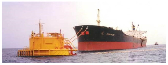 - Kang, Y.; Sun, L.; Kang, Z.; Chai, S. Coupled Analysis of FPSO and CALM Buoy Offloading System in West Africa. In Proceedings of the 33rd International Conference on Offshore Mechanics and Arctic Engineering, San Francisco, CA, USA, 8–13 June 2014; OMAE2014-23118; Volume 8A: Ocean Engineering; V08AT06A010. ASME. The American Society of Mechanical Engineers: New York, NY, USA, 2014; pp. 1–11. Available online: https://www.researchgate.net/profile/Shuhong-Chai/publication/278675856_Coupled_analysis_of_FPSO_and_CALM_buoy_offloading_system_in_West_Africa/links/5582ce9708ae12bde6e63129/Coupled-analysis-of-FPSO-and-CALM-buoy-offloading-system-in-West-Africa.pdf (accessed on 11 September 2021). [CrossRef]