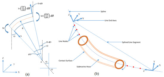 An illustration showing (a) displaced hose-beam element showing moments and forces, and (b) Submarine hose segment showing spline line and nodes.