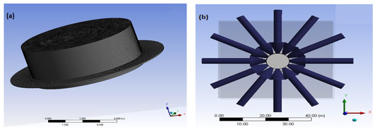 The design consideration for the floating CALM buoy is for operation in 100 m water depth. The model is established by using ANSYS AQWA 2020 R2 [8,75,76], where diffraction/radiation method is applied in solving the 3-dimensional problems of the floating CALM buoy. The adopted wave spectrum is the JONSWAP (Joint North Sea Wave Project) wave spectrum in the numerical analysis. The boundary box for the sea area utilised for the numerical model in ANSYS AQWA 2020 R2 is 150 m by 150 m. The hydrodynamic panel approach was used in the diffraction analysis, as shown in Figure 4a, depicting the ocean-view buoy model, with the wave direction on the buoy. The buoy’s skirt was designed as solid with a smaller diameter to accurately reflect its effective zone, which is detailed in Table 1. The ocean (or environmental) conditions used for the study, including the waves, depicted in Figure 4b, are carried out according to industry standards [88,89,90,91]. The hydrodynamic components are presented in Section 2.5, with details in [8,9].