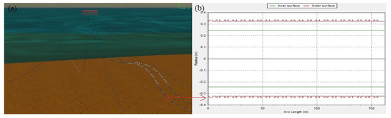 The submarine hoses are in Lazy-S configuration, as illustrated in Figure 1 and Figure 6, was designed for 1900 KN/m2 (19 bar) pressure application. Two submarine hose strings are connected to the base of the buoy at the top and the pipeline end manifolds (PLEMs) at the bottom. Each of the submarine hoses is 162.065 m lengthwise, consisting of 43 sections and 525 segments, as presented in Table 2. In the model, there are 21 hose sections in the each hose-string—Hose1 and Hose2. They are compartmented into 3 groups—the far-end (Group-Section 1), the mid-sections (Group-Sections 2–20) and the near-end (Group-Section 3). Both the far end and the rear ends have reinforced hose ends. The fluid contents inside, the internal pressure, the self-weight, the buoyancy and the weight of the floats are considered. A uniform contents method was applied to model the fluid contents of the hose, which is crude oil with a density of 821 kg/m3. Fully filled conditions are assumed with 0 kPa inner pressure of the fluid in the hose. The Orcaflex 3D view of the CALM buoy Lazy-S model, showing the ocean environment, is presented in Figure 7a. The section profile for the submarine hose in Orcaflex 11.0f is depicted in Figure 7b. The outer and inner diameters of the hoses are 0.650 m and 0.490 m, respectively. The model for the submarine hose has already been validated in some research studies [8,9].