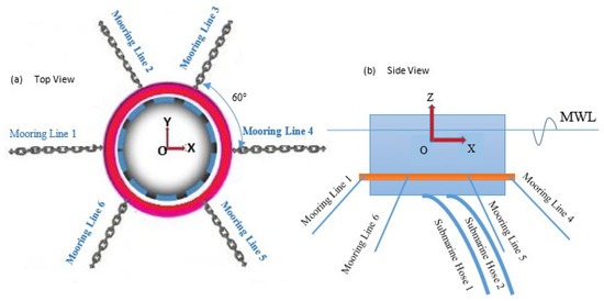 - Le Cunff, C.; Ryu, S.; Duggal, A.; Ricbourg, C.; Heurtier, J.; Heyl, C.; Liu, Y.; Beauclair, O. Derivation of CALM Buoy coupled motion RAOs in Frequency Domain and Experimental Validation. In Proceedings of the 17th International Society of Offshore and Polar Engineering Conference, Lisbon, Portugal, 1–6 July 2007; no. 2007-NaN-594. International Society of Offshore and Polar Engineers (ISOPE): Cupertino, CA, USA, 2007; pp. 1–8. Available online: https://www.sofec.com/wp-content/uploads/white_papers/2007-ISOPE-Derivation-of-CALM-Buoy-Coupled-Motion-RAOs-in-Frequency-Domain.pdf (accessed on 29 September 2021).