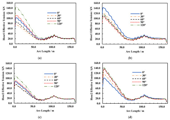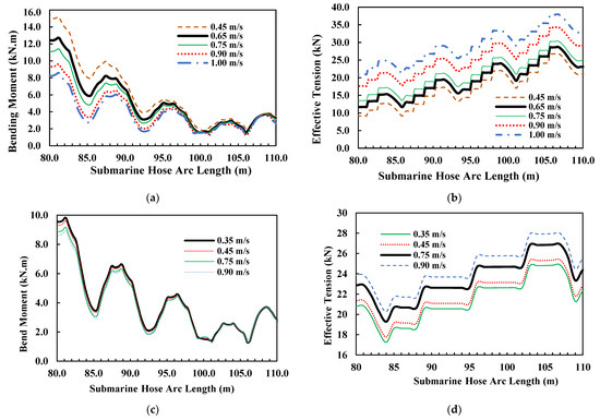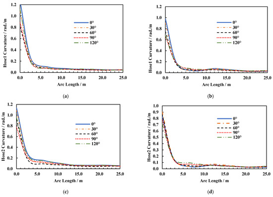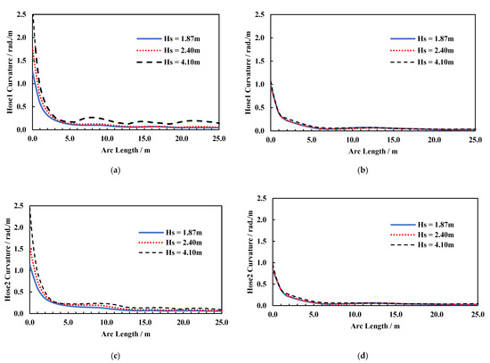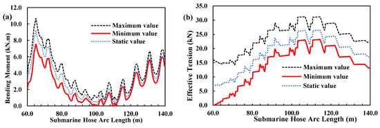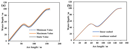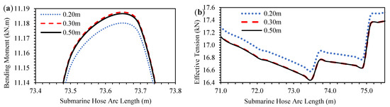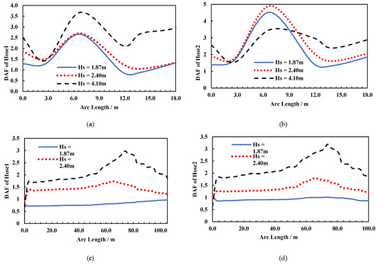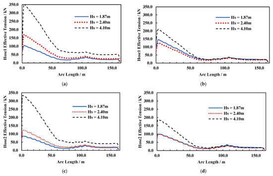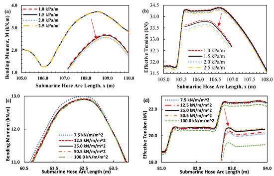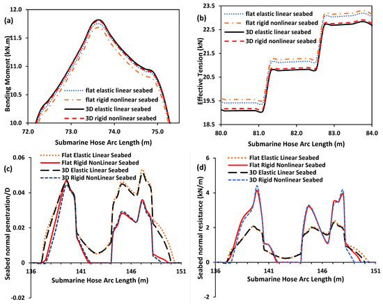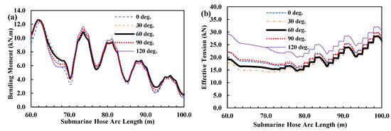 Secondly, another challenge reported in the industry is the unexpected rate of marine hose failures due to high curvatures, nonlinearities, control issues, and hose material failure. Some of these failures are from valve malfunction, weak hose couplings, or over tensioned hoses. If marine hoses are tensioned too much as if they are Top Tensioned Risers (TTRs), they could have vey high strains which could lead to material failures. These failures are evidenced in reports on bonded flexible risers failures and marine hose failures [65,66,67,68,69]. However, these hoses satisfy design requirements, but sometimes fail during operation. Thus, recent innovations for controlling marine hoses include hose motion/failure sensors, failure trackers, dual carcass, surge protectors, marine breakaway couplings (MBCs), butterfly valves, hose control systems, and hose end valves (HEVs). Thus, it is necessary to improve the design for the submarine hoses, as well as other factors. In earlier literature ([8,9]), the dynamic amplification factor (DAF) study was presented to help with the problem of submarine hose failures, due to high curvatures. The advantage of DAF is that the maximum dynamic response amplitude can be determined using the static response amplitude without any additional requirement for time history analysis [70,71,72]. For the hose model, it is also essential to consider the different wave periods, flow angles, soil stiffness, and nonlinearities, like the nonlinear seabed models. The proposed modelling technique will help increase design accuracy and reduce computational time in the design of submarine hoses, particularly on nonlinear seabeds. It will also reduce to submarine hose issues due to wave loads which are not predicted during the design stage.