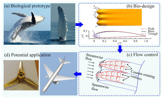 The great capacity of the aquatic creatures in the environment, extensively utilized as the references for many current underwater vehicles, has been developed [3,4]. Unlike other whales (such as the blue, fin, and minke), which feed by swimming swiftly forward and swallowing food-laden water, the humpback whale relies on pectoral flippers with specialized protuberances (Figure 1a) to readily conduct water acrobatic movements to grab prey [5,6]. Then, from biology to hydrodynamics, the study perspective has changed. Protuberances, as a bionic passive flow control means, can increase hydrodynamic performance while eliminating complex, expensive and demanding maintenance. Conventional wings with straight leading-edges produce flow behaviors with performance limitations due to the co-varying features of lift, drag, and stall. However, simply a little alteration in hydrofoil geometric form (Figure 1b) can provide appealing flow phenomena without additional equipment, or any other material.