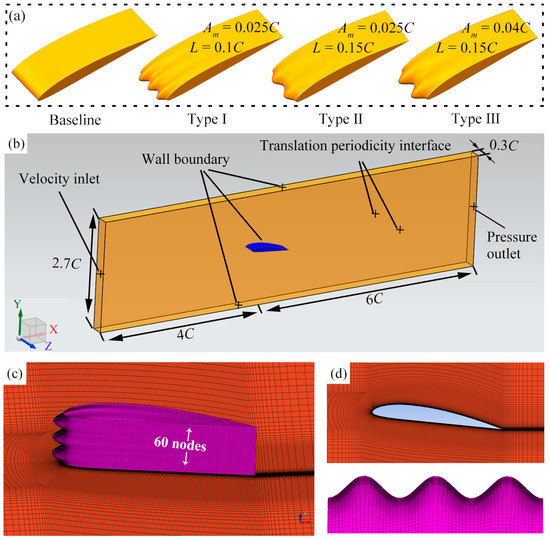 The protuberance structures chosen from the humpback whale’s pectoral flippers are employed as biological prototypes for bioinspired hydrofoils, as seen in Figure 1a. According to the literatures [5,9], humpback whales have protuberances on their pectoral flippers with a spanwise range of 10–50% of the chord length and an amplitude of 2.5–12% of the chord length, respectively. Considering the complexity of the morphology and kinematics of actual flippers cannot be effectively represented by numerical analysis, the simplified geometry of the baseline hydrofoil is modified with sinusoidal protuberances.
