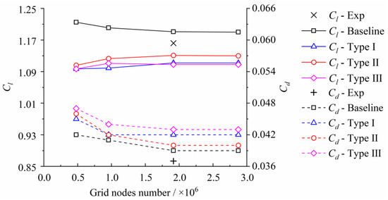 To confirm the grid dependency, four grid layouts were created, with the only change being the node numbers (i.e., 15, 30, 60, 90) in the spanwise direction. For four cases, the mid-span grid distribution was the same for accurately capturing the boundary layers. The grid scheme was validated by an analysis of the lift coefficients (Cl) and drag coefficient (Cd) under non-cavitation at AOA = 8° according to existing test data of the baseline hydrofoil [36]. The force coefficients were as follows:
