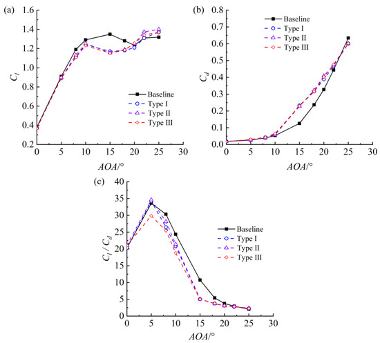 Figure 4 depicted Cl and Cd computed at various AOAs, with an emphasis on the hydrodynamic characteristics of the baseline and modified hydrofoils. For the baseline hydrofoil, the Cl grew approximately linearly from AOA = 0–10°, and the stall occurred at 15° with an abrupt loss of lift and substantial increases in drag. However, the Cl profiles of the modified hydrofoils rose with lower slopes before a decrease around 10°. They then maintained sustained growth after 15°, indicating a stronger post-stall feature. For the Cd profiles of the baseline hydrofoil, a sharp increase was observed after 10°. However, it displayed a linear continuous increase from 10° to 25° in modified hydrofoils. The lift-to-drag ratio Cl/Cd profiles demonstrated that the baseline hydrofoil performed better at 5° < AOA < 20° owing to the high Cl. The maximum Cl/Cd of Type I and II at AOA = 5° were 1.81% and 2.97% higher than that of the baseline, respectively, whereas Type III had an 11.16% drop due to a larger Cd.