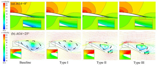 Velocity magnitude distributions of the mid-spans of the baseline hydrofoil and the peak sections of the modified hydrofoils in the XY plane at AOA = 8°, (a) and AOA = 25° (b).