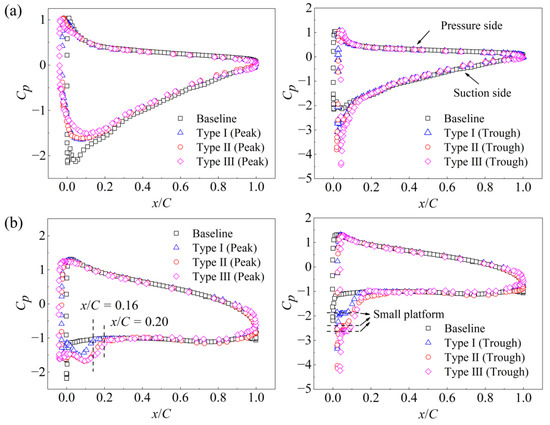 The investigation of force fluctuations along the spanwise was ensured by the analysis of surface pressure characteristics. Figure 6 compared the chordwise pressure coefficients (Cp) over the peak and trough of the modified hydrofoils at AOA = 8° and 25° to the baseline hydrofoil. The title x/C = 0 is on the leading-edge of the hydrofoils, and x/C = 1, on the trailing-edge. At AOA = 8°, the flow remained on the suction side of all the hydrofoils, since the pressure coefficient was gradually increasing from the leading-edge to the trailing edge. The results show that the minimum Cp in the tough region of the modified hydrofoils was much smaller that of the baseline, implying an earlier onset of cavitation. In contrast, a higher minimum Cp of the peak region suggested a reduced cavitation probability. In this case, it was more crucial for the wave amplitude to affect the minimum Cp. At AOA = 25°, the wide separation on the whole suction side could be seen for the baseline hydrofoil as the Cp was almost constant from the leading-edge to the trailing-edge. For the modified hydrofoils, Cp was constant after x/C = 0.16~0.20 along the peak of protuberance, indicating a delay flow separation corresponding to Figure 5. According to the Bernoulli equation, the flow past the trough region would experience a pressure rise during the anticipated stroke, resulting in a larger reverse pressure gradient and a premature flow separation. Due to the low-pressure effect, the Cp of the trough region performed a “small platform” [43]. For the high AOA, the wavelength showed a greater influence on the minimum Cp.