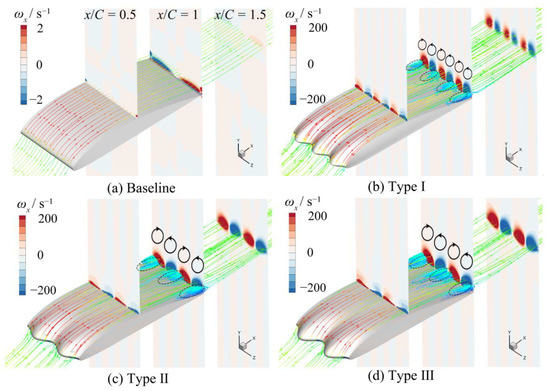 Streamwise vortices mechanism as the most widely accepted hypothesis was used to visualize the flow control mode. The fundamental assumption was that the streamwise vortices induced by the wavy leading edge enhanced the momentum exchange of the boundary layer. The 3D streamlines could directly exhibit the vortex structures on the suction surface of the hydrofoils. In addition, the slides of steamwise vorticity ωx were extracted at different streamwise positions at AOA = 8° to emphasize the existence and intensity of downstream counter-rotating vortices. Figure 7 demonstrated that the mainstream was disturbed by the protuberances, resulting in visible vortex flow in the tailing-edge of the modified hydrofoils. The flow past each protuberance, together with a pair of counter-turning vortices, was essentially symmetric and exhibited a regularity comparable to the prior researches [11,13]. As the flow developed downstream, the area of ωx expended. The region of ωx expends in area as the flow develops downstream. However, the impacted region of Type I was obviously smaller than the other two modifications. It was noticed that the vortex on the left side rotated clockwise, while the one on the right side turned anti-clockwise. These counter-rotating vortices thereby drove flows to diverge along the trough plane, while causing them to converge along the peak plane [44]. As a result of the composite action of the two neighboring vortices, low pressure coefficients and significant unfavorable pressure gradients occurred at the trough regions, producing early flow separations.