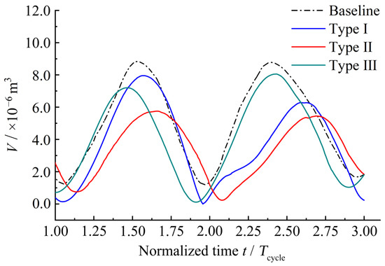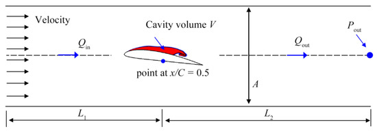 Strong instability caused by the cavity shedding will cause severe vibrations, which are not permitted during the safe operation of hydraulic machinery. A simplified one-dimensional model was calibrated using the Type II findings to readily evaluate the instantaneous variations of the present cavitating flow, as illustrated in Figure 14. It was assumed that there was a cavity with volume V on the suction surface, and the liquid phase was incompressible [48]. Then the flow continuity equation was given by the variations of flow rate between inlet and outlet boundaries: