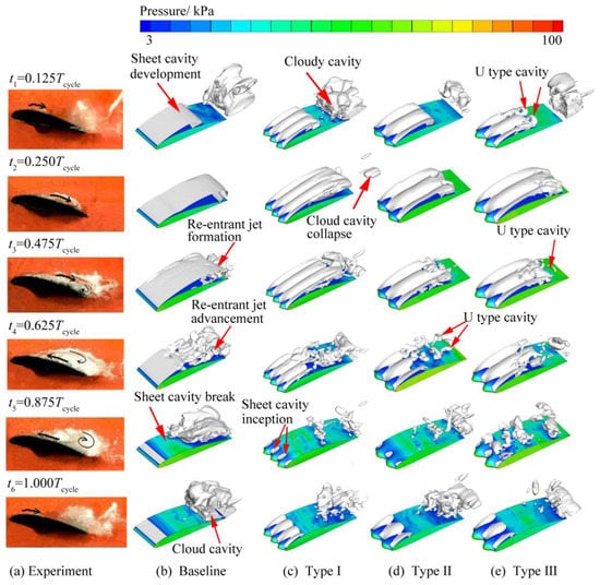 In the streamwise direction, the transient flow characteristics around the baseline and modified hydrofoils were comparable. At t1 = 0.125 Tcycle, the transparent attached cavity grew continuously from the leading-edge, and its behavior appeared relatively stable until the anti-clockwise cavitation vortex and re-entrant jet flow emerged in the trailing-edge at t3 = 0.475 Tcycle. During this process, the attached cavity of the baseline hydrofoil reached nearly to the whole suction side, and the large vapor could from the breakup of the preceding sheet cavity still remained in the trailing-edge. The length of the sheet cavity and the scale of the cloud cavity were both diminished in different degrees in respect of the modified hydrofoils. Following that, the re-entrant jet flow collided with the main flow, rose upward, and then destroyed the cavity interface between t4 = 0.625 Tcycle and t5 = 0.875 Tcycle. At the rear of the hydrofoil, the sheet cavity partially split and there was a new cloud cavity. Finally, at t5 = 1.000 Tcycle, a newly attached sheet cavity continued to periodically form at the leading-edge, while the shedding cloud cavity gradually lifted up from the wall and collapsed downstream in the next cycle. The numerical model described the transient cavity features well.
