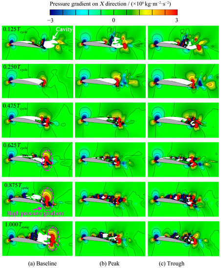 In Figure 10, the mid-span of the baseline hydrofoil, the mid-spans of the trough and the peak of the Type I hydrofoil were selected to examine the differences in transient cavity behaviors along the streamwise direction. Notably, the inception of sheet cavity was only detected in the leading-edge troughs, whereas peak regions had practically no cavitation bubbles. It was assumed to be caused by the modified hydrofoils’ unique spanwise Cp distribution, as illustrated in Figure 6. Relatively thin sheet cavity developed from the stable low-pressure region. For the baseline hydrofoil, the spanwise distribution of the sheet cavity at the leading-edge was nearly homogeneous. This behavior was also consistent with other experimental findings [20]. Furthermore, the presence of the counter-rotating vortices disturbed the flow field following the protuberances, and enhanced the momentum of boundary layer. As a consequence, the modified hydrofoils were able to resist the large adverse pressure gradient, which weakened the chordwise development of the cavity and considerably reduced its scale compared to the baseline hydrofoil. The pressure gradient distribution on the X-direction was also presented in Figure 10, to further explain the difference in the behaviors of cavity development between the two hydrofoils and to further highlight the mechanism of cavitation shedding. The negative pressure gradient at the leading-edge promoted the growth and convection of the sheet cavity. At t3 = 0.475 Tcycle, a flow separation in closure region produced a change in the pressure gradient at the rear of the hydrofoil, leading in the development of a re-entrant jet that ruptured the vapor-liquid interface. From t4 = 0.625 Tcycle to t6 = 1.000 Tcycle, it was obvious that there was a negative pressure gradient in front of the split cavity and a positive pressure gradient behind it, which would cause the cloud vapor to rotate. Meanwhile, a significant high-pressure gradient formed near the trailing-edge, indicating a pressure fluctuation in this region and a possibility for surface erosion. Hence, one advantage of the modified hydrofoil was that it decreased the pressure gradient at the trailing-edge, thus shrinking the shedding cavity, and reducing the negative impact of vibration on operating performance.