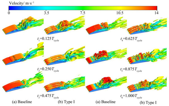 To better visualize the vortex structures during the cavity shedding process, Figure 11 depicted the iso-surfaces of velocity based in the Q-criterion (Q = 2 × 104 s−2) for the baseline and Type I hydrofoils. The variable is defined as follows: