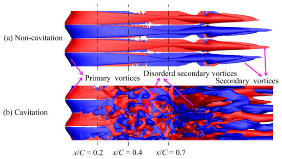 In Figure 12, the iso-surfaces of ωx = ±200 under the non-cavitating and cavitating flows were given to provide an intuitive description of the variations of the streamwise vortices after cavitation. For non-cavitation, the primary streamwise vortices existed at x/C = 0.2 plane and the secondary streamwise vortices formed from roughly x/C = 0.7 plane, thus these two planes as well as x/C = 0.4 plane were examined immediately. According to the previous studies [12,46], there would be a downwash velocity component in the peak and an upwash velocity component in the though due to the counter-rotating vortices. Based on the Prandtl lifting line theory, the downwash velocity component could lower the local effective AOA, resulting in a higher Cp in the peak at the leading-edge as shown in Figure 6. The upwash velocity could instead increase the local effective α, resulting in a lower Cp in the trough as compared to the baseline hydrofoil. Furthermore, it was evident that there were disordered and mixed vortices formed after the x/C = 0.2, indicating that no effective upwash or downwash was induced in the cavitation regions.