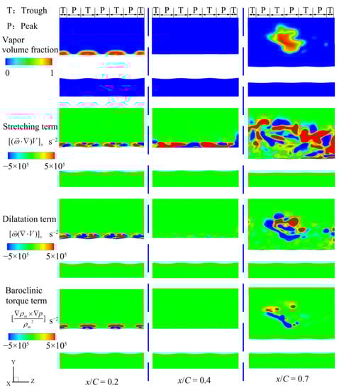 Figure 13 showed that the sheet cavity developed steadily from the leading-edge at the x/C = 0.2 plane. It was seen that the vapor distribution decreased significantly downstream of the peaks. Here, the first three decomposition terms of the vorticity were symmetrical with the vapor distribution along the trough centerline, and the primary streamwise vortices began to partially break up. Actually, water was considered to be incompressible in the region without cavitation [47]. So, the values of the vortex dilatation and baroclinic torque terms were equal to zero at the x/C = 0.4 plane, and only the stretch term played an important role. At the x/C = 0.7 plane, there was a rather large-scale cloud cavity with irregular shape. As a result of the destroyed spanwise pressure gradient, the secondary streamwise vortices could not develop in an ordered manner equivalent to the non-cavitation condition. At the same time, the distributions of the three decomposition terms were obviously disordered due to the non-uniform and violent flow in the cloud cavity. The vortex stretching term was particularly noteworthy due to the abrupt shift in the size and direction of the vorticity caused by the non-uniform velocity.