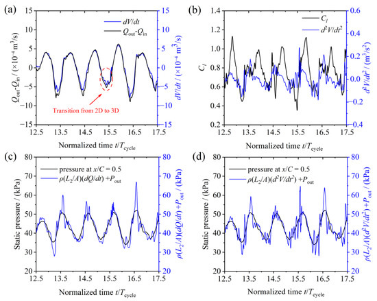 One-dimensional analysis results: (a) comparison of the flow rate difference and the first derivative of the V, (b) comparison of the calculated lift coefficient and the second derivative of the V, (c) pressure fluctuations in the unsteady Bernoulli equation, and (d) comparison of the numerical pressure fluctuations and the one-dimensional model.