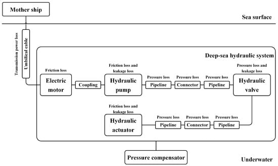 Various deep-sea operation equipment, such as human occupied vehicles (HOVs) [1], remotely operated vehicles (ROVs) [2], submarine mining vehicles [3,4], autonomous underwater vehicles (AUVs) [5], and submarine cable trenchers [6], have been successfully designed and developed. In addition, with them, humans have carried out much scientific exploration and resource development in the deep-sea environment. These high-power deep-sea operation equipment are usually powered by a motor-driven hydraulic system [7,8], and the power is provided by the mother ship on the sea surface through an umbilical cable, as shown in Figure 1. The loss in each power transmission link is also indicated in Figure 1.
