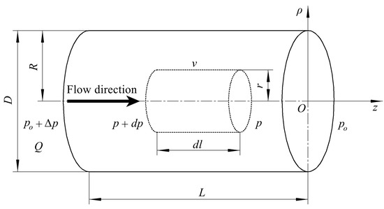 When in the state of laminar flow, the fluids flow in the axial direction without interfering with each other. Therefore, in the radial direction, the forces of the micro-cylinder are balanced. In the axial direction, the micro-cylinder is subjected to the forces caused by pressure at both ends and the viscous friction force caused by the rest of the fluid on its surface, which are expressed as follows.