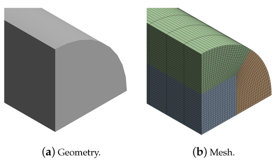 Due to the symmetry of the circular pipeline, a quarter of the fluid domain in the pipeline is established in the CFX software to save computing resources, as shown in Figure 4a. The inner diameter D and length L of the pipeline are set as 4 mm and 2 m, respectively, indicating that it is a significant slender pipeline. In order to obtain better mesh quality, the fluid domain is divided into three regions containing a cuboid with a square bottom for mesh generation, as shown in Figure 4b. For the three regions on the end face, each edge or curve is divided into 20 equal parts. In addition, the model is divided into 4000 equal parts along the axial direction to reduce the aspect ratio of the elements and so as to improve the quality. Then, the number of generated hexahedral elements and nodes are 4,800,000 and 5,045,261, respectively.