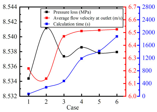 To improve the precision and reliability of the simulation results, a mesh independence study was conducted based on the aforementioned simulation settings. Table 1 lists the number of total mesh elements in six cases. How the pipeline pressure loss, the average flow velocity at the outlet, and the calculation time change with the number of elements are shown in Figure 5. According to Table 1 and Figure 5, the pressure loss and the average flow velocity can be considered stable when the number of mesh elements exceeds 4,800,000. The calculation time increases with the number of mesh elements and is about 1200 s or about 20 min in the case with 4,800,000 elements. Therefore, the CFD simulation of a model with 4,800,000 elements has satisfied calculation accuracy and fast calculation speed at the same time.