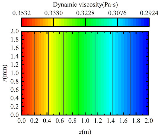 In the textbooks or handbooks of the hydraulic system [27,28,29,30], when analyzing the Poiseuille flow with a constant viscosity in a circular pipeline, the law expressed by Equation (21) is also described. Therefore, it can be known that the change in viscosity when flowing through the pipeline does not affect the velocity distribution.