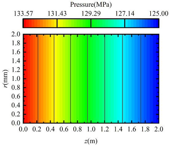 The simulated pressure loss can be obtained by reading the average value of the inlet pressure and subtracting the set outlet pressure of 125 MPa from it, as shown in Table 2. The theoretical values calculated according to Equations (3) and (23) are also listed.