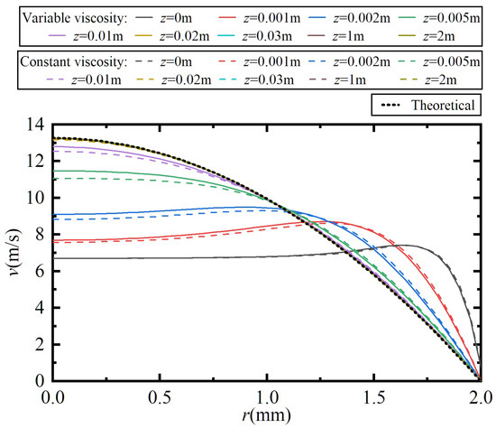 The flow velocity distribution is shown in Figure 9, in which the theoretical distribution curve according to Equation (22) is also plotted. Figure 9 shows that, regardless of whether the viscosity change during the flow process is considered, the flow velocity distribution is in good agreement with each other, which is consistent with the theoretical analysis in Section 2. The velocity distribution at the inlet or at a position less than 0.01 m away from the inlet is quite different from the theoretical distribution. This is caused by the uniform input of fluid at the flow inlet with an average flow velocity. The difference only exists in positions less than 0.01 m away from the inlet, whose range is extremely low compared to the pipeline length of 2 m. As for a position more than 0.01 m away from the inlet, the velocity distribution is in good agreement with the theoretical distribution.