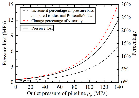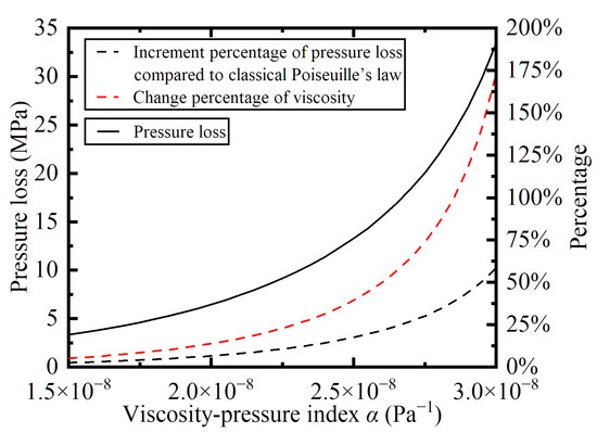 It can be known from Figure 10 and Figure 11 that the pressure loss increases with the increase in the viscosity-pressure index or the initial viscosity. The greater the viscosity index is, the faster the pressure loss increases, while the pressure loss changes approximately linearly with the initial viscosity. The increment percentage of pressure loss compared to classical Poiseuille’s law and the change percentage of viscosity show a similar pattern of change.