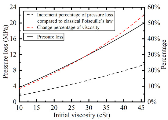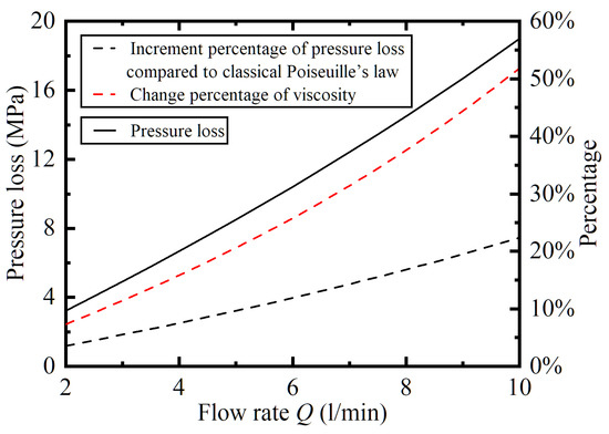 According to the percentage curves in Figure 10 and Figure 11, it can be known that, when the viscosity of the hydraulic oil flowing through the pipeline changes minimally, the pressure loss calculated by Equation (23) is less different from the classic Poiseuille’s law. When the viscosity changes greatly, the difference between the two calculation methods becomes larger. According to Figure 10, when the viscosity-pressure index is Pa, the viscosity changes by 172.30%, and the difference in pressure loss calculated by the two methods reaches 58.31%.