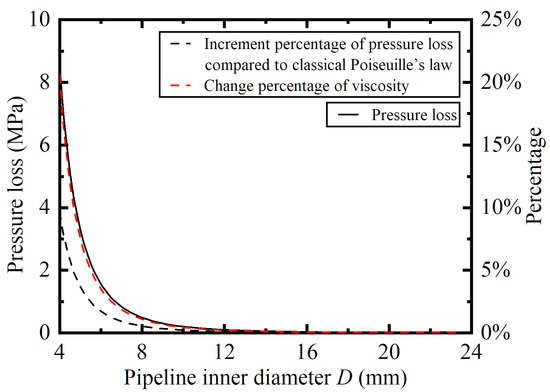 According to the discussions in the previous subsections, when the pressure loss or the viscosity change is minimal, the pressure loss calculated by Equation (23) is almost the same as the result of the classic Poiseuille’s law. In this subsection, the relationship between them will be discussed from the perspective of theoretical analysis.