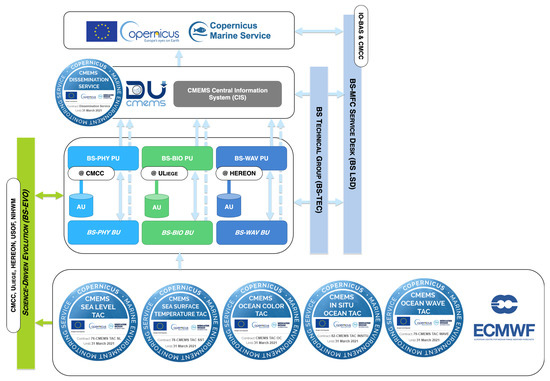 The BS-MFC uses an operational framework based on a high-level architecture, represented in Figure 2. Three production units (PU) are responsible for the system and operational services, including evolutions of the physics (BS-PHY PU), biogeochemistry (BS-BIO PU), and wave (BS-WAV PU) components (run by CMCC, ULiege, and HEREON, respectively). Each PU is connected to its own archiving unit (AU) for the long-term storage of the BS-MFC products, and to a backup unit (BU) in the case of nominal operational failures and recoveries in order to guarantee the continuity of operational services. Additionally, each PU implements dedicated interfaces: (a) with the BS-MFC technical group, for the technical implementation of the product catalogue (BS TEC), (b) with the dissemination unit (DU) through the delivery buffer zone, for the operational delivery of the products (CMEMS CIS), and (c) with the BS-MFC service desk (BS LSD), for user support through the CMEMS service desk. Service evolution activities, aimed at R&D activities, are implemented at the PU level, with the collaboration of USOF and NIHWM (BS-EVO). Observations used by BS-MFC systems for assimilation and validation purposes are summarized in Table 1.