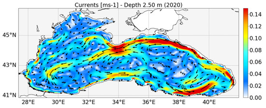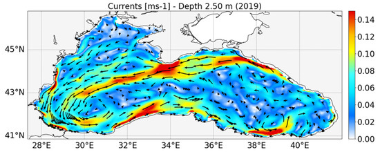Estimated accuracy numbers (EANs) for BS-PHY NRT were computed using the daily means analysis fields and compared with available observations (Table 1). Root mean square difference (RMSD) and bias were estimated over the period of 2019–2020. Table 2 and Table 3 show EANs computed in the period of 2019–2020 for temperature and salinity, respectively, using ARGO in situ profiles. The evaluation was performed in specific layers. Table 2 shows the averaged RMSD for temperature, which ranges from a maximum of 2.1 °C at 20–30 m to below 0.55 °C for depths greater than 75 m. The temperature bias is around zero over the water column. Regarding salinity (Table 3), the error is approximatively 0.26 PSU in the 5–50 m layer, and then increases to about 0.4 PSU in the halocline. Below 200 m, it is less than 0.1 PSU. Salinity bias is generally slightly negative on the subsurface, but never greater than 0.2 PSU. Regarding sea level, the system has an overall error of about 2.9 cm, while for sea surface temperature, the error is about 0.54 °C [6]. In order to highlight how BS-PHY NRT reproduces the main features of the circulation at the basin scale, Figure 3 and Figure 4 show surface currents as the mean in 2019 and 2020, respectively.