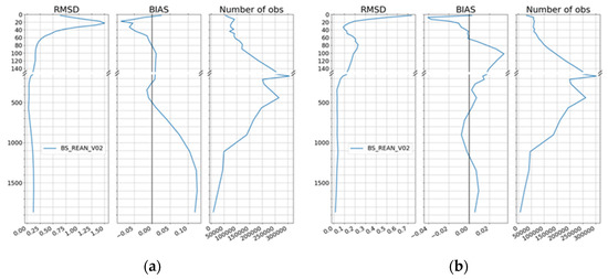 Vertical profiles of the root mean square deviation (left panel), bias (middle panel), and number of observations (right panel) for (a) temperature (°C) and (b) salinity (PSU) by comparing the reanalysis results with in situ profilers in the Black Sea domain from 1 January 1993 to 31 December 2019.