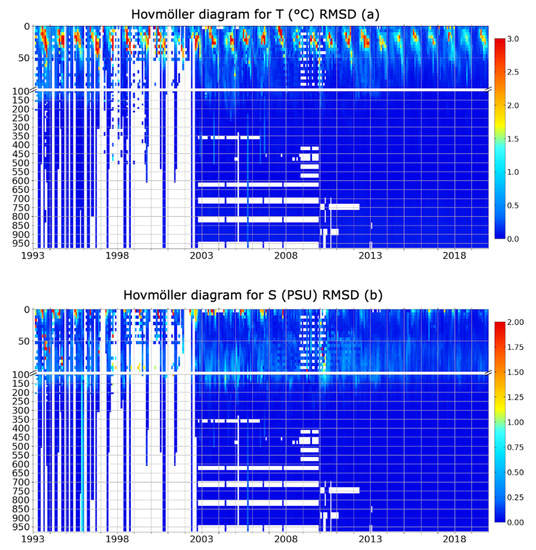 In the BS-PHY MY, the highest temperature RMSDs are at the seasonal thermocline depths of around 20 m as the values exceed 1.5 °C (Figure 5a). The temperature bias is satisfactory, with a maximum absolute value of about 0.07 °C at the surface, and around zero from 60 down to 500 m, then it increases up to 0.12 °C below 500 m. Salinity has the largest RMSD on the surface, with a maximum of 0.7 PSU (Figure 5b). Similar to the temperature, salinity RMSDs are relatively high at the halocline depths. The Hovmöller diagram of temperature RMSD reveals a clear seasonal pattern: the values are low (high) in winter (summer) so that the highest errors are in the seasonal thermocline (Figure 6a). The Hovmöller diagram of salinity RMSD shows that there is a seasonal signal in the error on the surface: RMSD exceeds 1.5 PSU near the surface before 2008. At depths of 50–150 m, the error decreases up to around 0.8 PSU; however, it is almost zero below 150 m (Figure 6b).