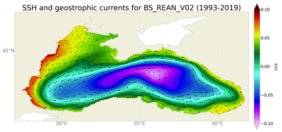 The Hovmöller diagrams reveal the lack of in situ observations between 1997 and 2003 in the Black Sea, which means that for many years the reanalysis system was only constrained by altimeter observations. In comparison with along-track sea level anomaly observations, BS-PHY MY product had a mean sea level anomaly RMSD of 2.24 cm from 1993 to 2019. Finally, the geostrophic currents estimated from the time-averaged sea level (1993–2019) reveal the Rim current, which surrounds the entire Black Sea and forms a large-scale cyclonic gyre (Figure 7). Major details are provided in [47].