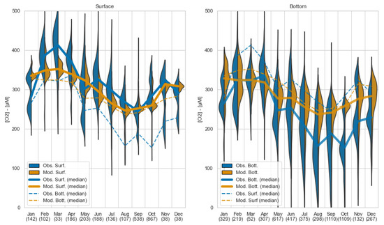 Seasonal cycle between 1992 and 2019 of the modelled (orange) and observed (blue) oxygen concentrations over the north-western shelf (at depths of 15–80 m) on the surface (left) and at the bottom (right). The number of observations for each month is reported along the X-axis.