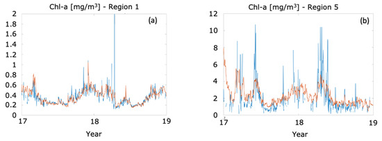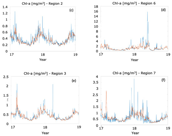 Time series of satellite (in blue) and model (in orange) chlorophyll spatial averages computed for optical characteristic regions as highlighted by [49].